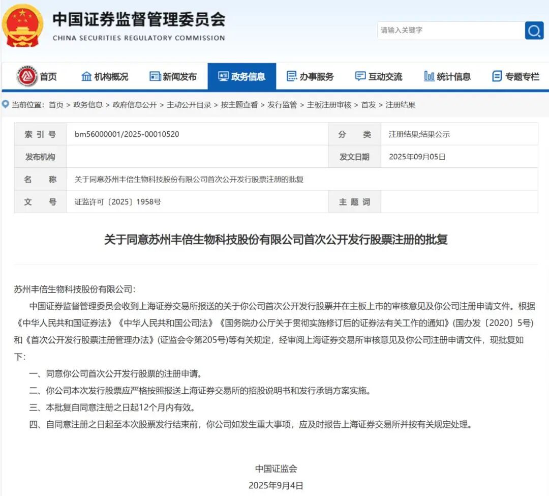 从东方财富网获悉,苏州丰倍生物科技股份有限公司(简称丰倍生物)已通过注册,即将在上交所主板上市。