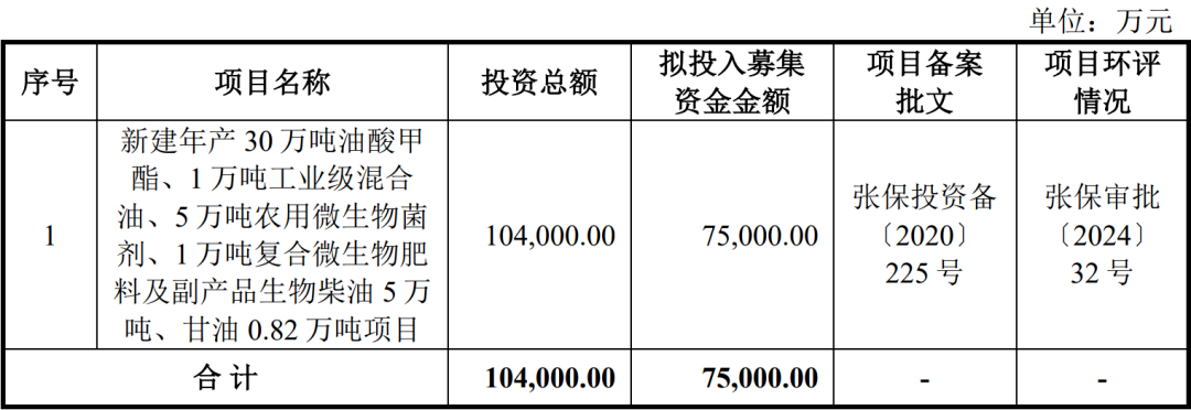 招股书显示,本次冲击上市,丰倍生物拟募集资金约7.5亿元,将投资于新建年产30万吨油酸甲酯、1万吨工业级混合油、5万吨农用微生物菌剂、1万吨复合微生物肥料及副产品生物柴油5万吨、甘油0.82万吨项目。