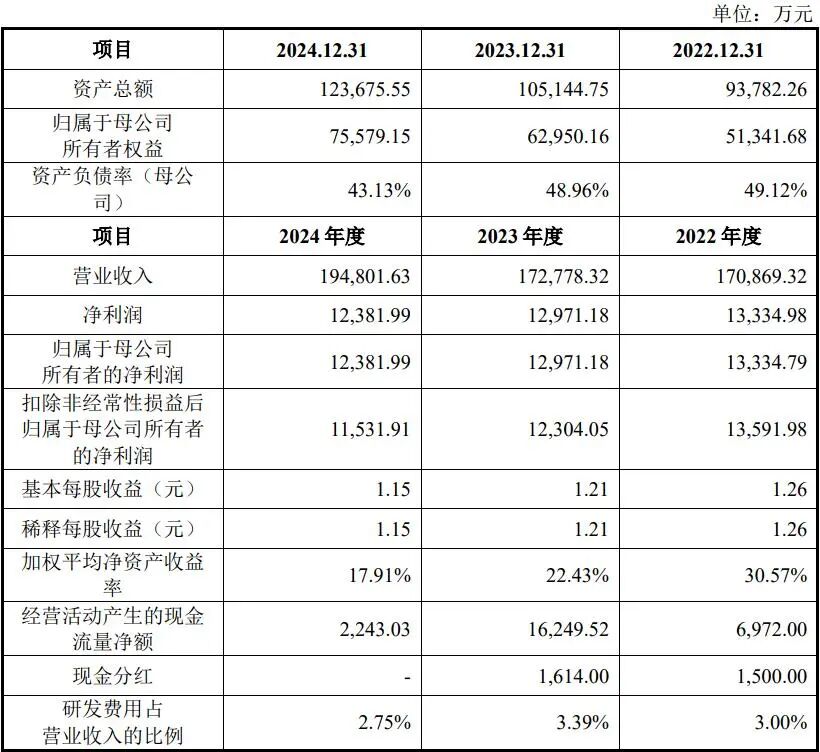 丰倍生物2022年、2023年、2024年营收分别为17.1亿元、17.3亿元、19.48亿元;净利分别为1.33亿元、1.3亿元、1.24亿元;扣非后净利分别1.36亿元、1.23亿元、1.15亿元。